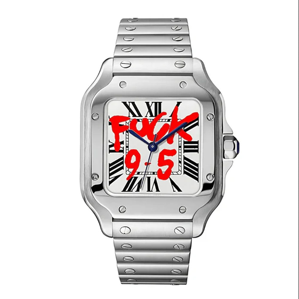 Introducing the Seiko Mod Santos "9 - 5" Edition, a custom Seiko NH35 Automatic Watch inspired by the iconic “Santos” design. This piece combines elegance and precision, featuring a White Roman "9 - 5" Edition aftermarket dial encased in a 38mm stainless steel frame. The transparent back piece allows a glimpse into the intricate automatic movement, making it a standout choice for watch aficionados.