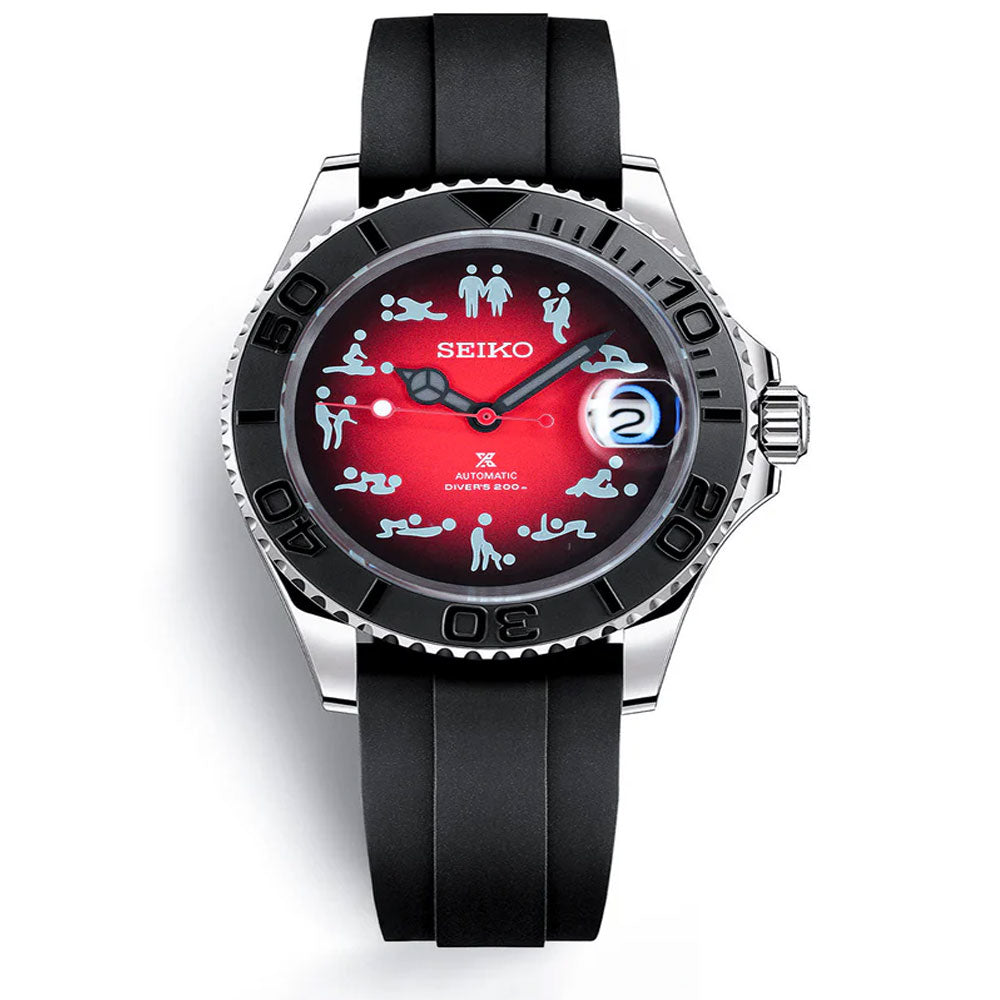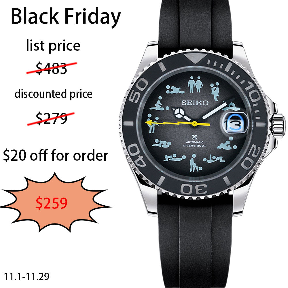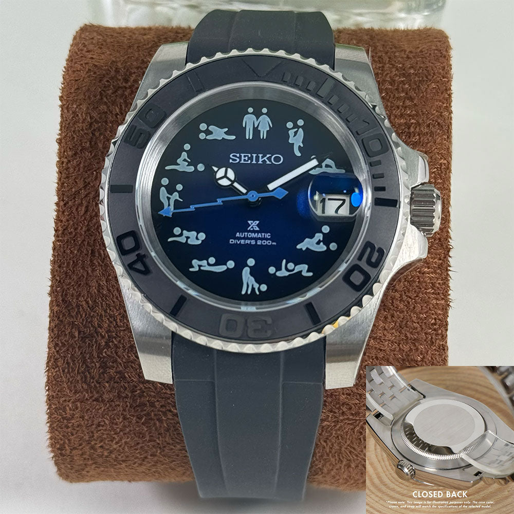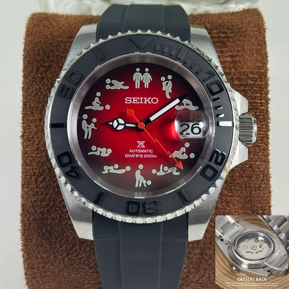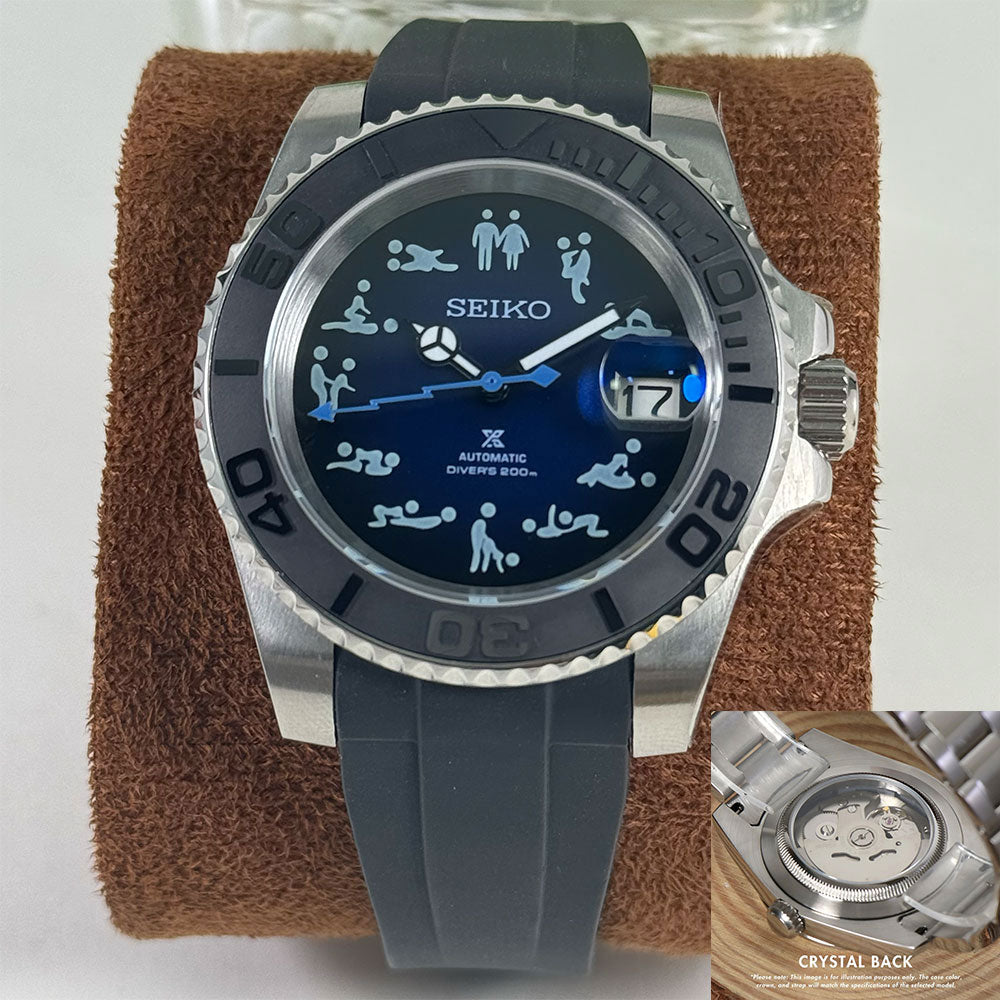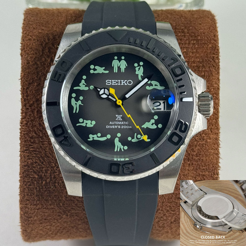 Introducing the SeikoMod Submariner Funny position , a custom Seiko NH35 Automatic Watch inspired by the iconic Submariner, meticulously crafted for watch enthusiasts seeking uniqueness and precision. This mode features a Black dial and a transparent back piece, allowing a glimpse into the intricate automatic movement.