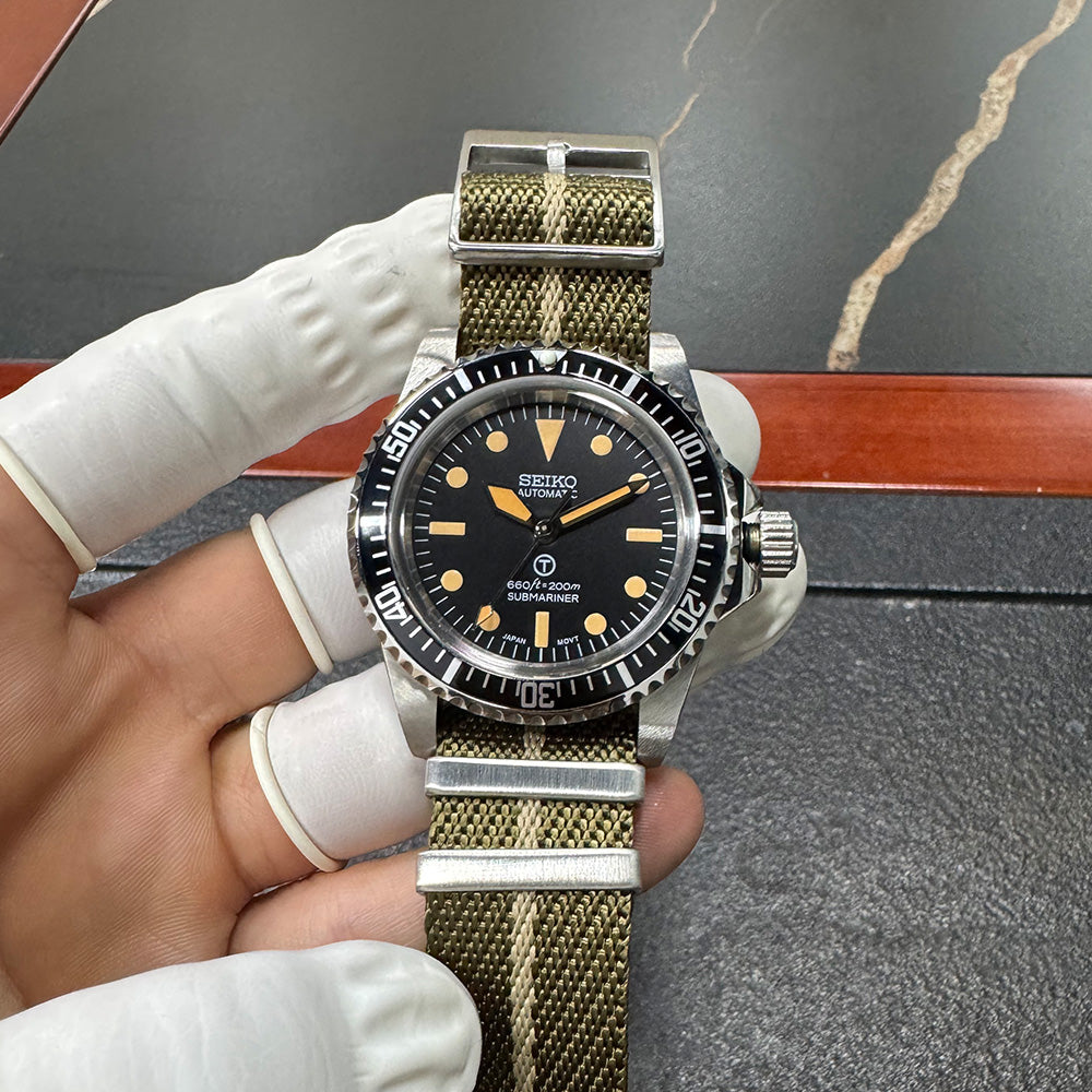 Introducing the Seiko Mod Submariner Vintage Black, a custom Seiko NH35 Automatic Watch inspired by the iconic Submariner, meticulously crafted for watch enthusiasts seeking uniqueness and precision. This mode features a Vintage Black dial and a closed back piece, allowing a glimpse into the intricate automatic movement.